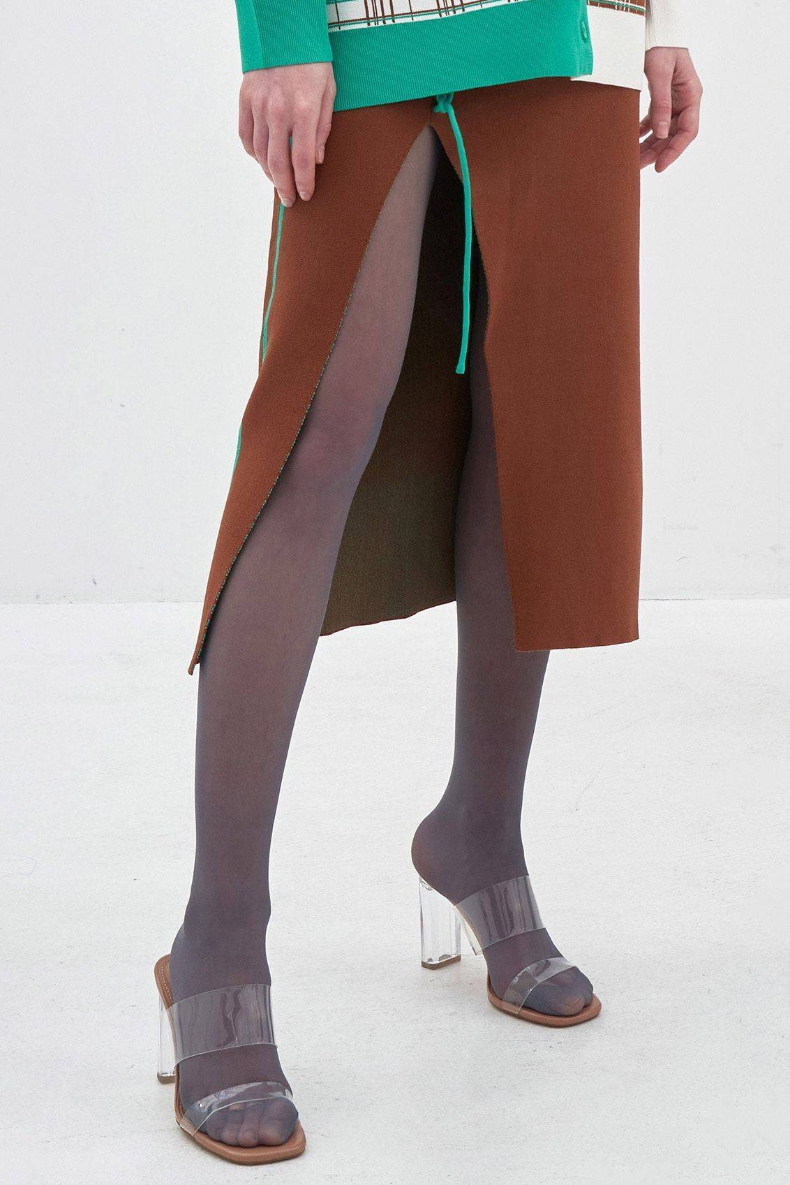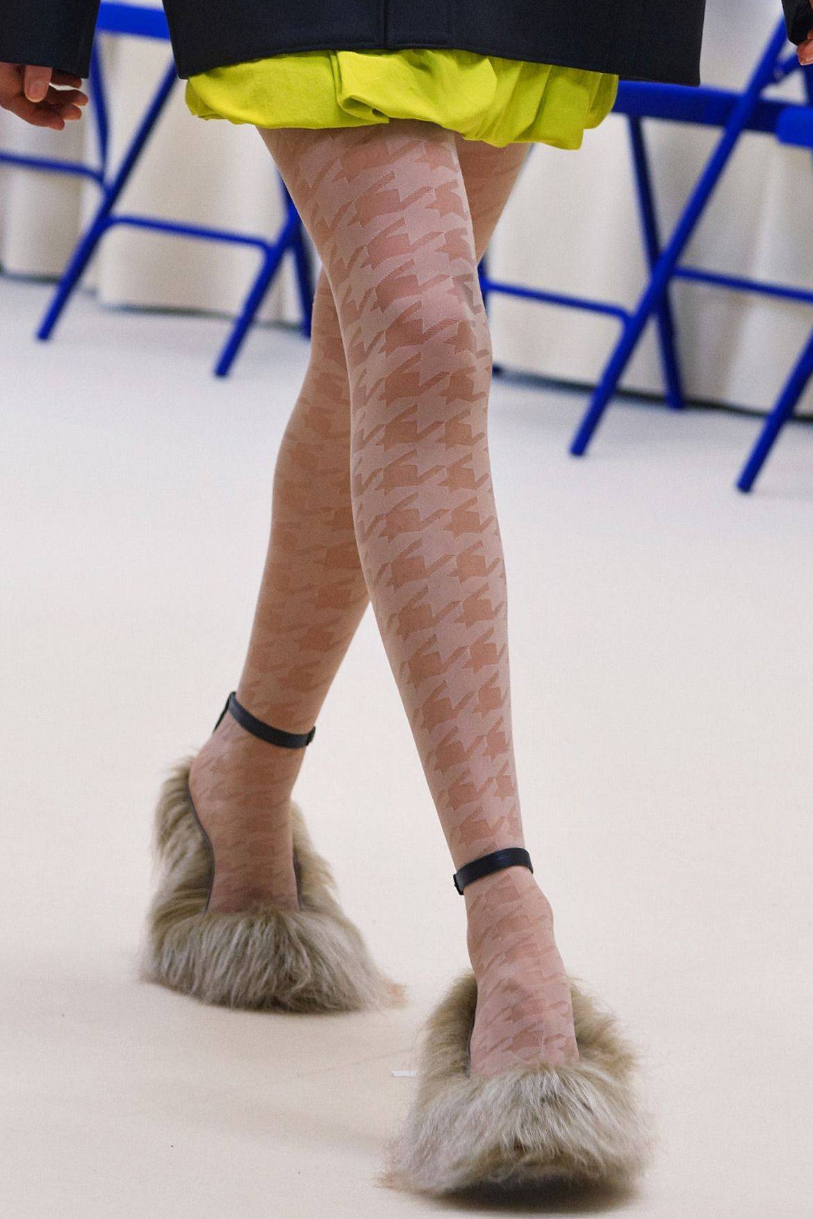 Тёмные серые, коричневые и синие оттенки не уступают в универсальности чёрным колготкам. Они выгодно внедряются не только в монохромные луки, но и с контрастной игрой. Стильным приемам учат мастера Anteprima, Cinq a Sept, Marine Serre и Matty Bovan.