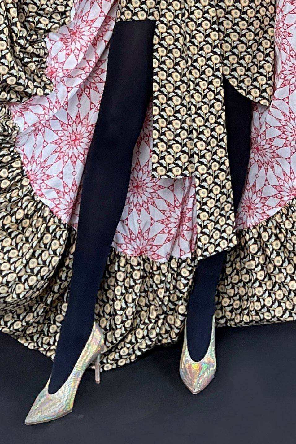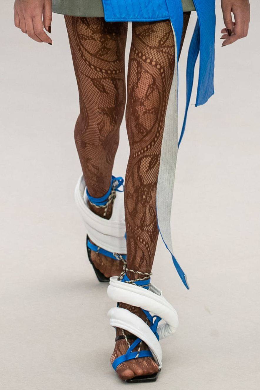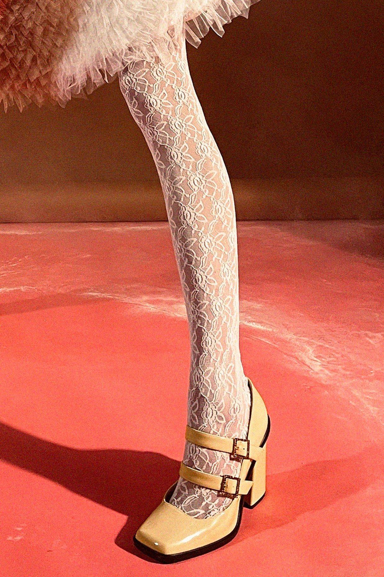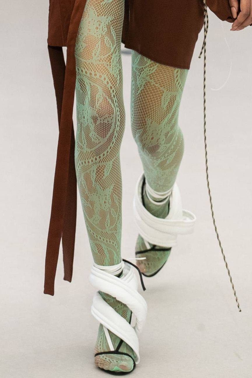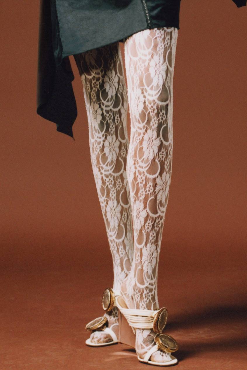 Флористические мотивы, будучи традиционным хитом ажуров, по-прежнему значатся в лидерах. Как модные дизайнеры используют трендовые колготки в тандеме с одеждами повседневного и праздничного гардероба, стоит подсмотреть у Vetements, Vaillant Studio, Vivetta и Ellery.