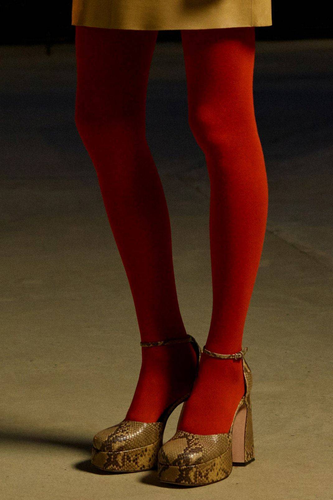 Поскольку в этом сезоне остро модны красные ботильоны, есть смысл совместить два тренда: колготки в тон обуви и красный цвет. Можно носить красные колготки и с черной обувью, комбинируя их с верхней одеждой серо-черной расцветки. Наиболее стильно выглядит темный оттенок красных ягод – самый модный цвет колготок 2021.