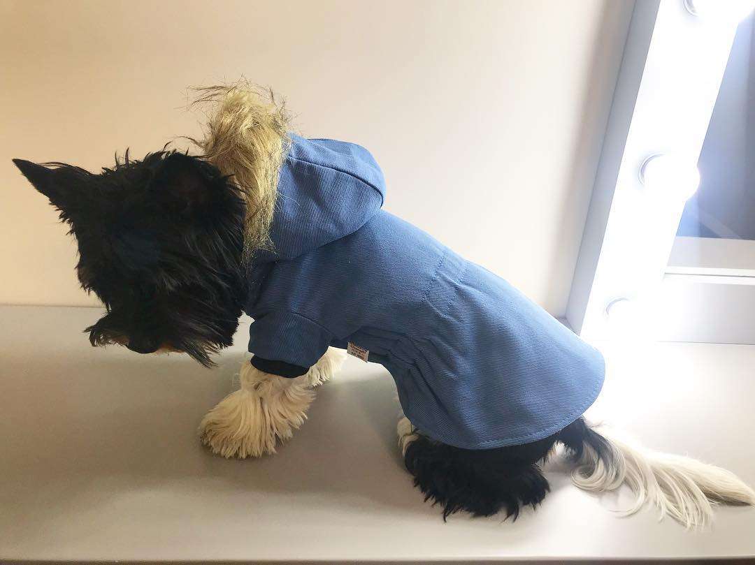 - поначалу оптимальным вариантом станет свободная одежда. Йорк не чувствует трения об шерсть, стеснения, не нервничает, быстрее привыкает;