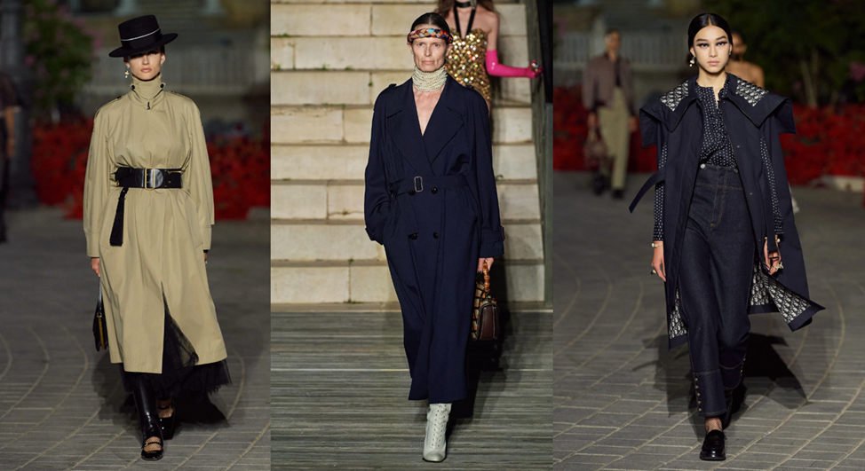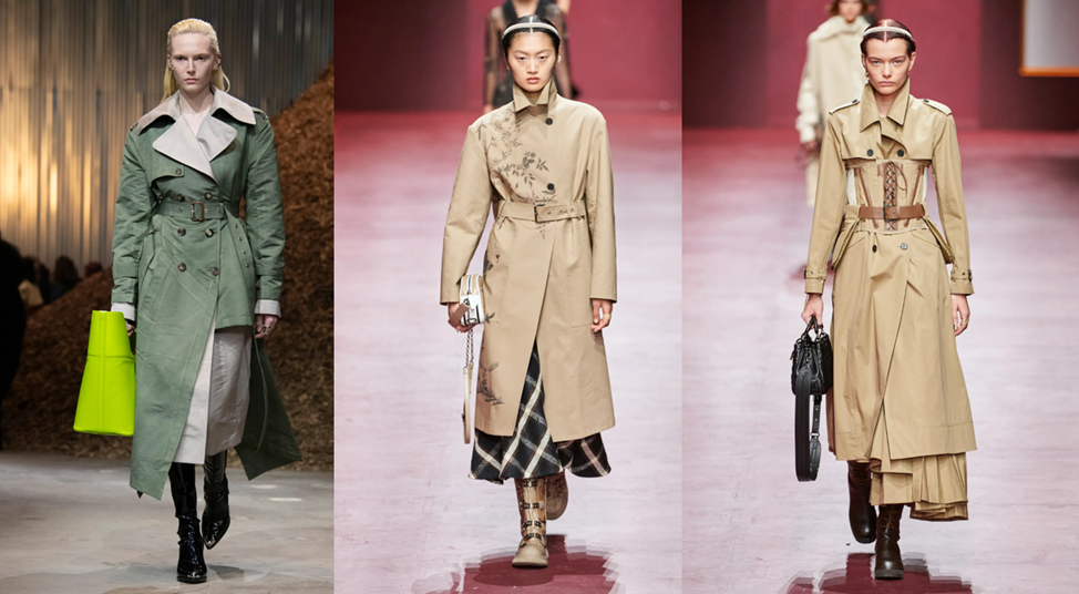 - Тренчи с карманами, лацканами, пуговицами в два ряда, шлицей, кокеткой (прототип военной формы).