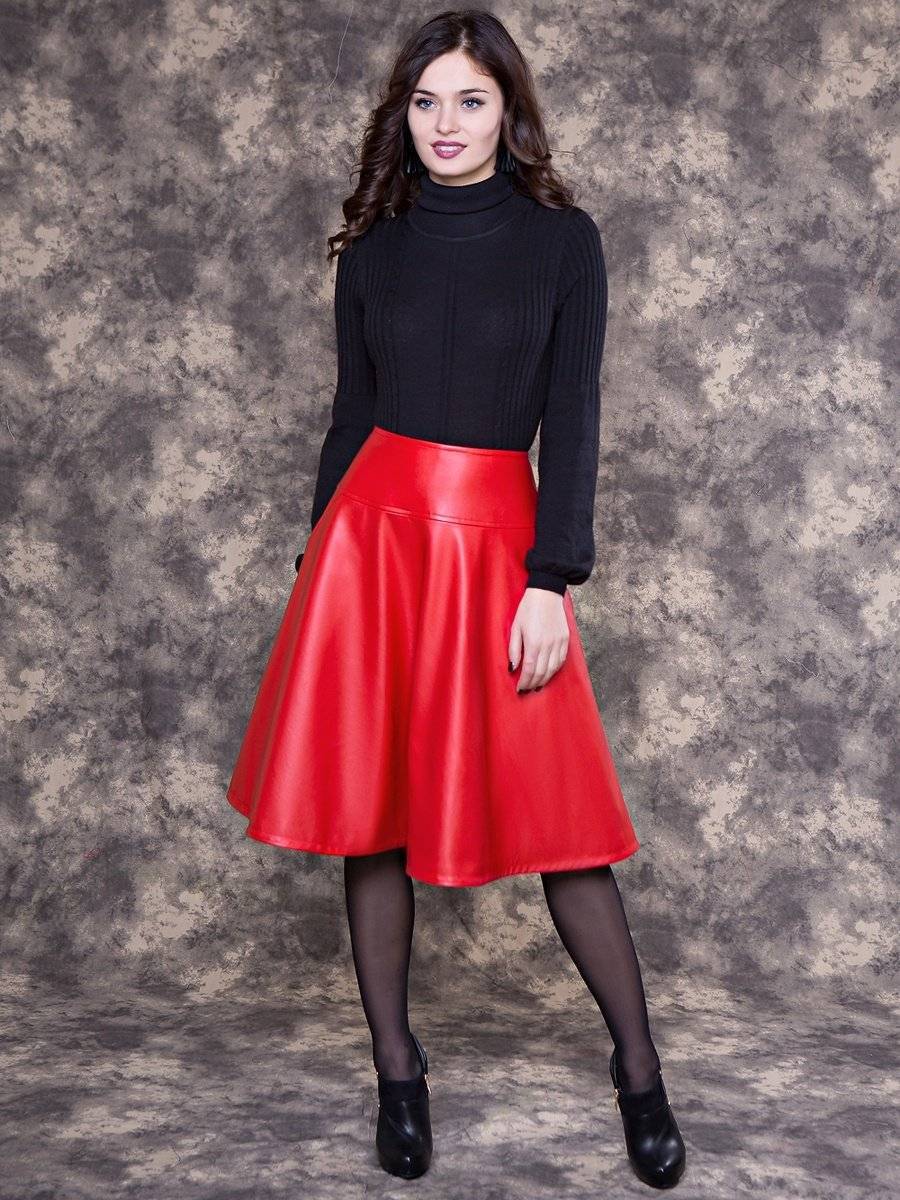 Бордовая кожаная юбка смотрится отлично в офисном варианте. Приглушенный оттенок обладает презентабельным видом. Такая юбка хорошо сочетается с одеждой в светлых тонах. Ее можно носить со свитерами оверсайз, лонгсливами, топами. Расклешенная модель отлично дополнит блузки в винтажном стиле.