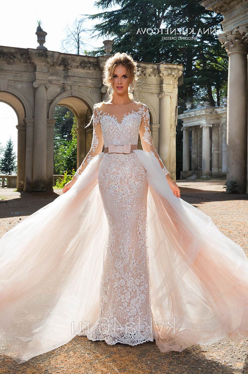 Крой нижней части свадебного туалета невесты чем-то напоминает хвост. Закрытые с длинным и коротким рукавом, с открытыми плечами, платья-бюстье, на широких и тонких бретелях – эти разновидности лифов присутствуют в сочетании с оригинальной юбкой-«хвостом».