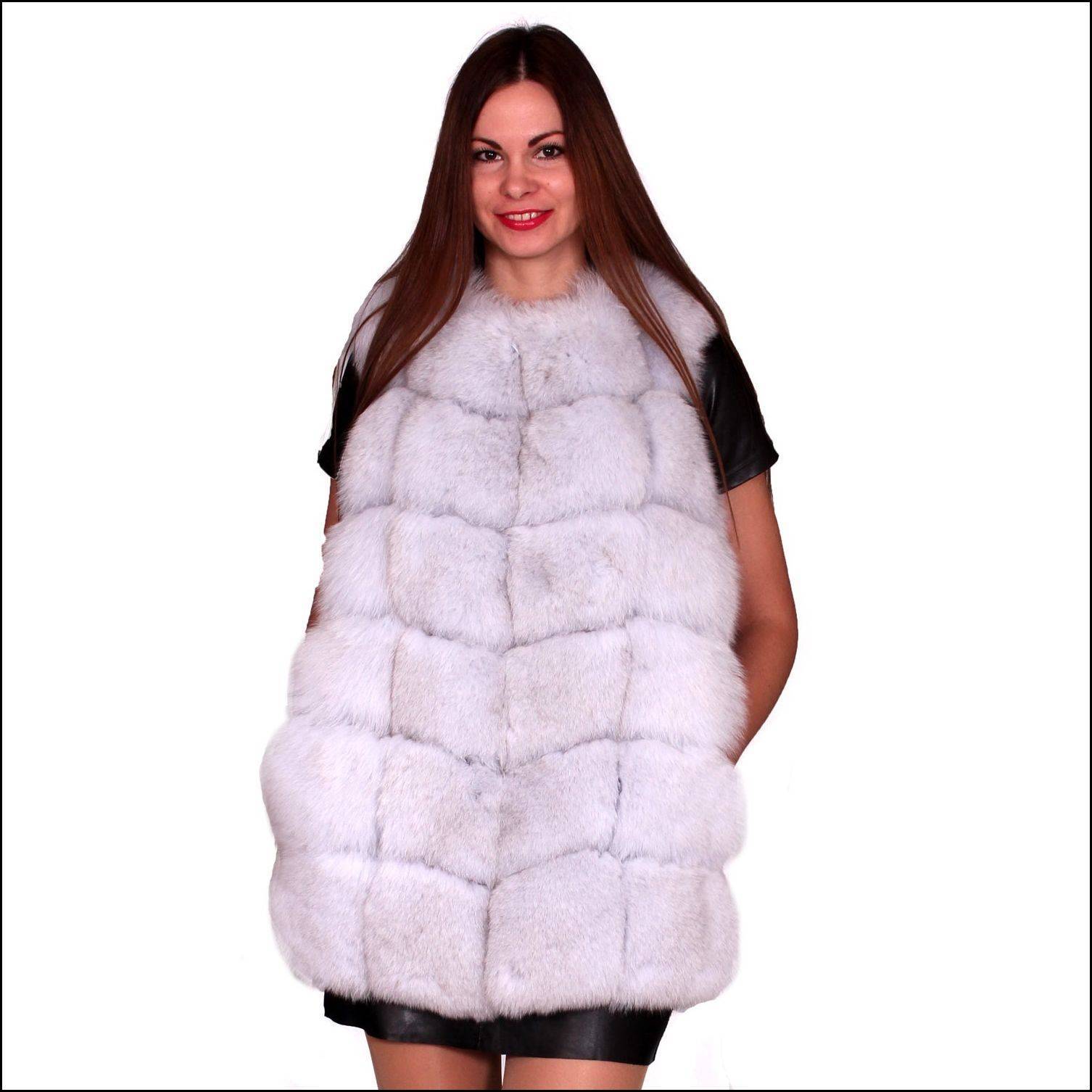 Жилетка из песца может иметь натуральный цвет или быть крашеной. В природе животное имеет белую (летом — серо-бурую) или голубую (летом — дымчато-серую) окраску. Шерсть у зверьков пышная и мягкая, правда, неоднородная на спинке и на брюшке. Больше всего ценится мех голубого песца.