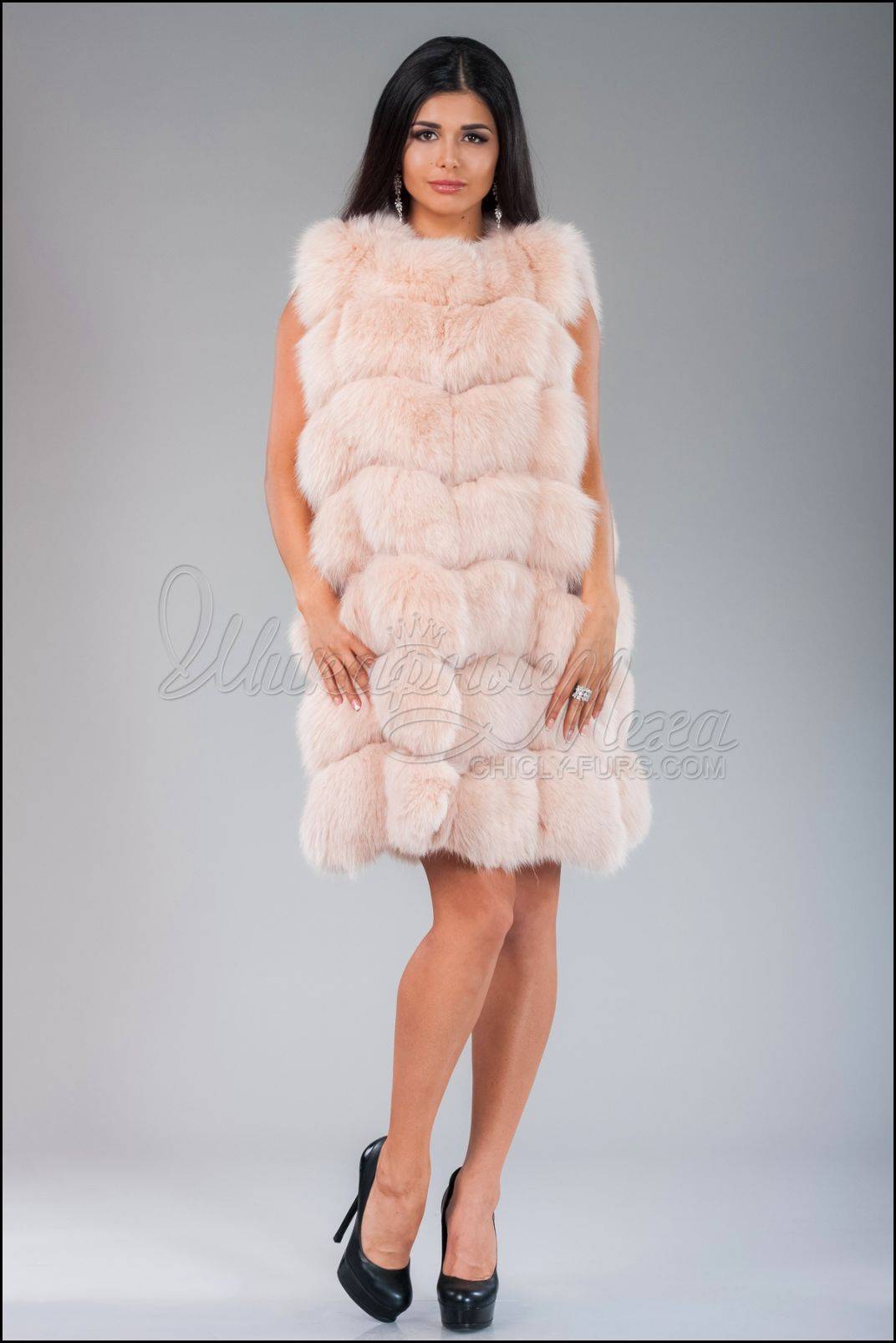 С большинством моделей песцовых жилеток отлично сочетается обувь на высоком каблуке, как тонком, так и утолщенном. Классика всегда в выигрыше.