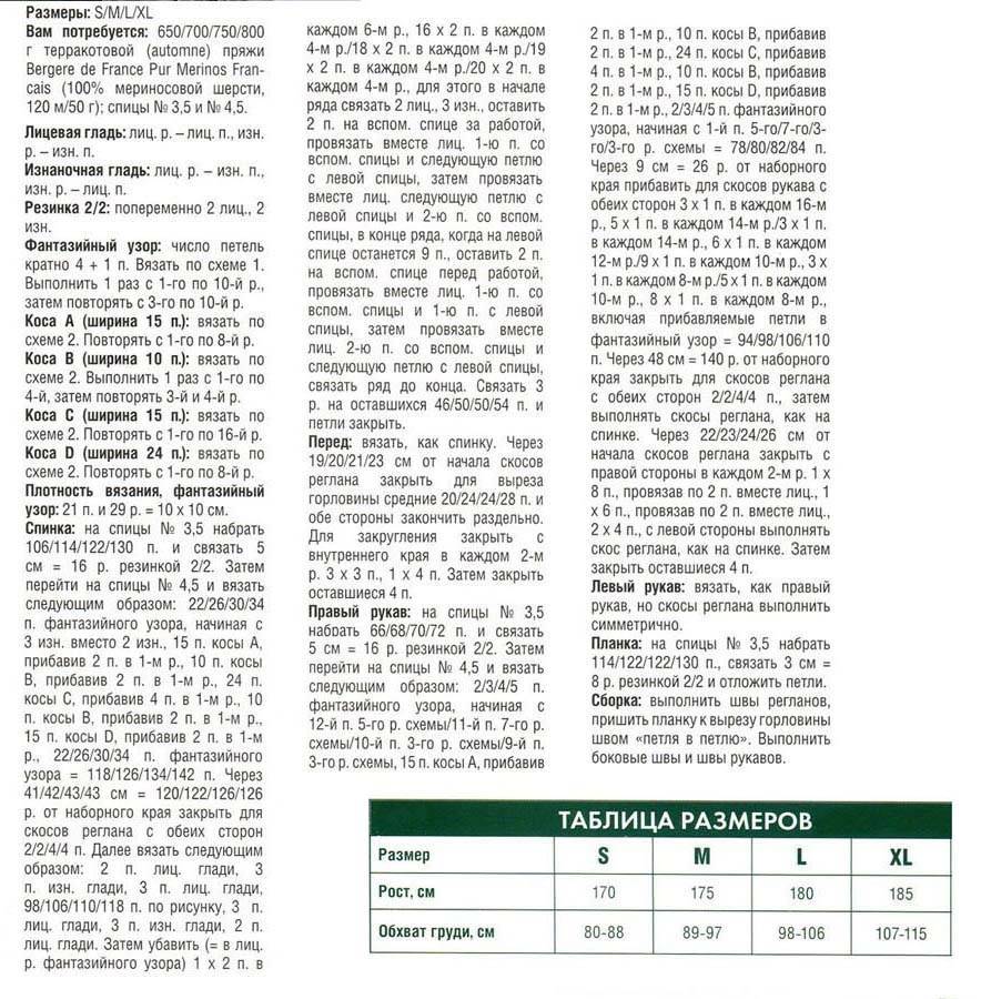 На спицы набрать по 60 П для каждого рукава. Манжету вывязывают резинкой 6 см. Первый ряд будет И, начинают с Л. В конечном ряду прибавляют 8 П. Получится 68 П. Переход производят на спицы побольше. Петли распределяют следующим способом: Л, 5 ПУ, 9 ПР, 7 ПУ, 24 П узором в виде косички 7 ПУ, 9 ПР, 5 ПУ.
