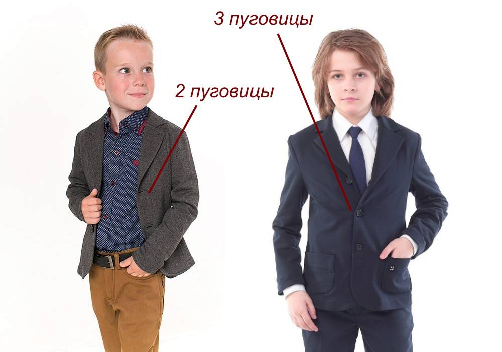 Такой пиджак отлично выглядит на ребёнке с любой фигурой. Подбирая вариант пиджака, необходимо учитывать, что при маленьком росте достаточно 2 пуговиц, тогда как высокому мальчику удобнее застегивать пиджак на 3 пуговицы.