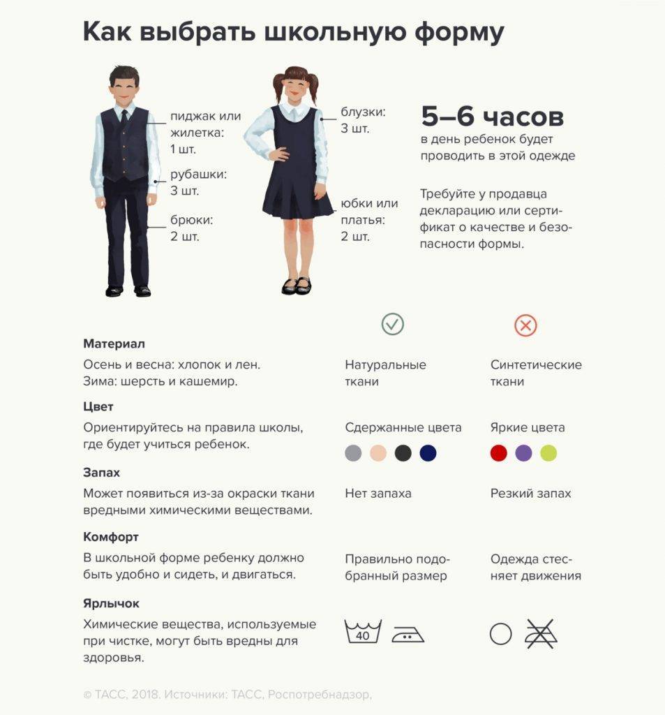 Наличие этих нитей обеспечивает комфорт детской коже, позволяя ей дышать, сохраняя нормальный теплообмен. Также натуральные нити не вызывают аллергических реакций. Стремясь сохранить здоровье ребенка и обеспечить ему удобство на весь день, предпочтительно подбирать школьный костюм, сшитый из ткани с минимальным количеством синтетики. На ярлычке обязательно указывается состав ткани.