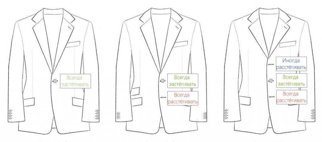 Некоторые звезды позволяют себе носить двубортный пиджак расстегнутым, однако в хорошем обществе не принято это делать. Поднимаясь, мужчина застегивает все пуговицы пиджака, и может расстегнуть его исключительно во время сидения. Стоит отметить, что на двубортный пиджак не распространяется правило не застегнутой нижней пуговицы. Позволяется застегнуть обе нижние пуговицы, однако многие считают, что модные мужские костюмы не стоит застегивать «наглухо» и можно оставить одну верхнюю пуговицу расстегнутой.