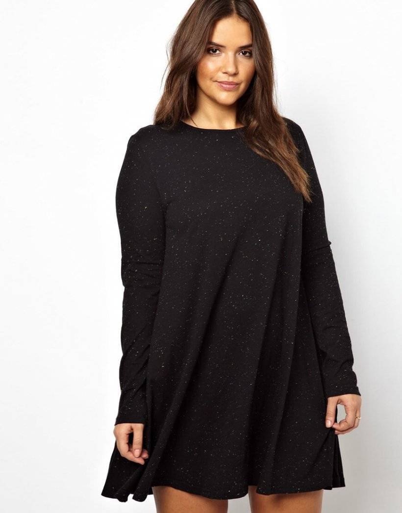 Платья, которые подходят полным женщинам с животом и боками, представлены в основном в трапециевидном силуэте. Вы точно не ошибетесь, если сделаете ставку на простой фасон, который будет слегка облегать область декольте и расширяться в нижней части. Преимущества такой модели очевидны, ведь она красиво преподносит даже полную фигуру и радует отменным комфортом.