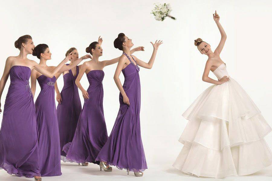 4. Один цвет, разные фасоны. Сейчас это один из самых популярных вариантов. Здесь невест и подружек спасают платья-трансформеры, а также марки, шьющие несколько разных фасонов платьев из одной ткани.