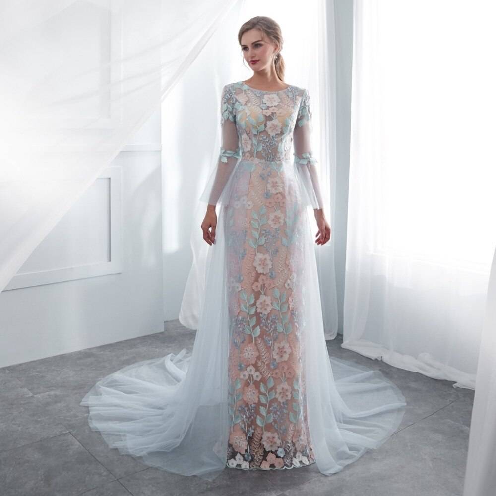 Чтобы создать нежный лук, стоит выбрать длинное платье с прозрачными рукавами. Они могут минимально закрывать плечи.