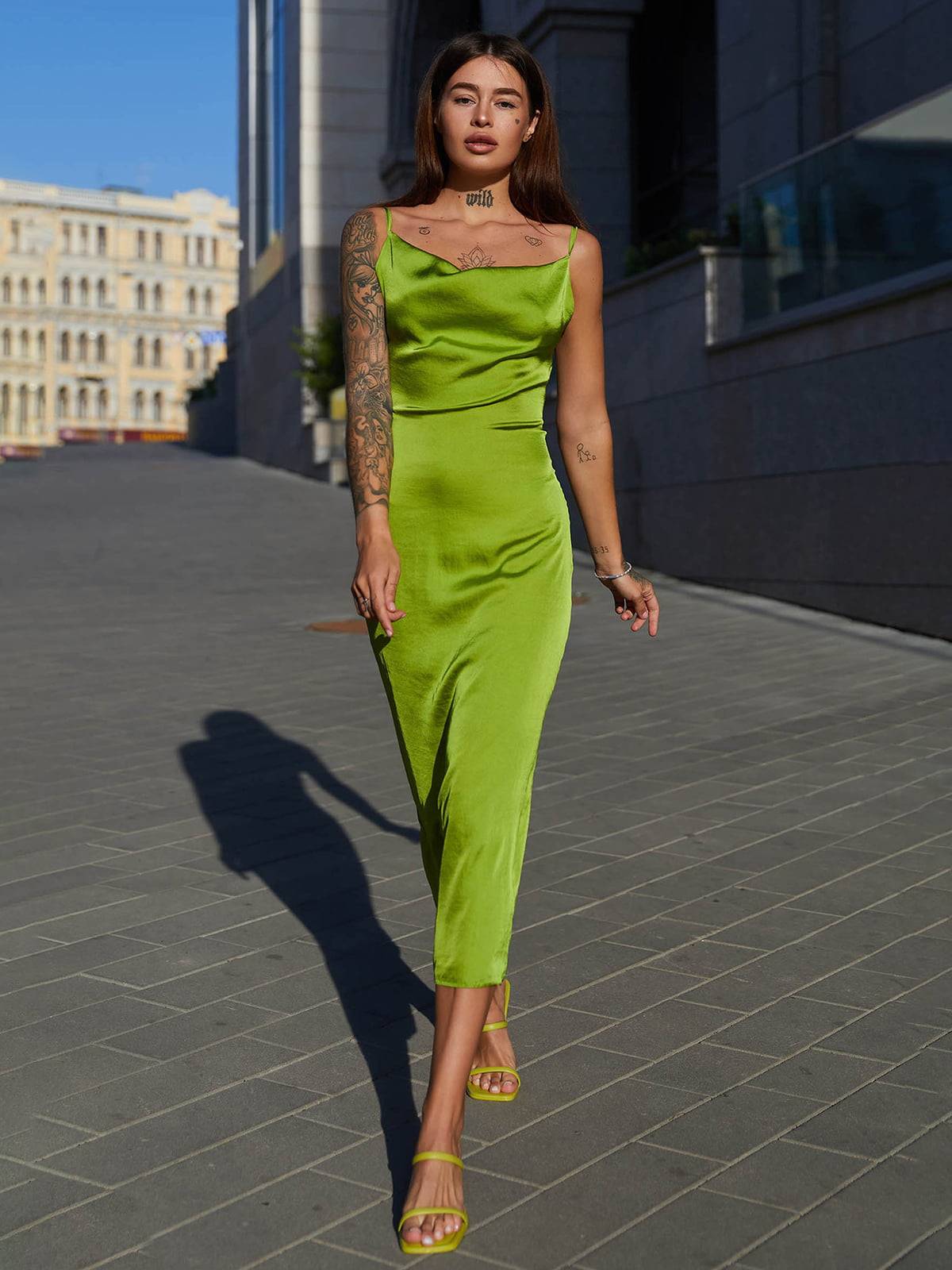 Он делает акцент на зоне декольте, при этом и ключицы, и плечи могут быть закрыты. Под категорическим запретом для модных платьев вырез ворота «лодочка» и хомут.