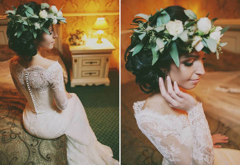 Вставка из другого вида материи на спине будет видна только в случае отсутствия фаты. Укладку также стоит выбирать с высоким закреплением волос. Обычно такие модели не имеют других акцентов, поэтому кружевную спину нельзя прятать.