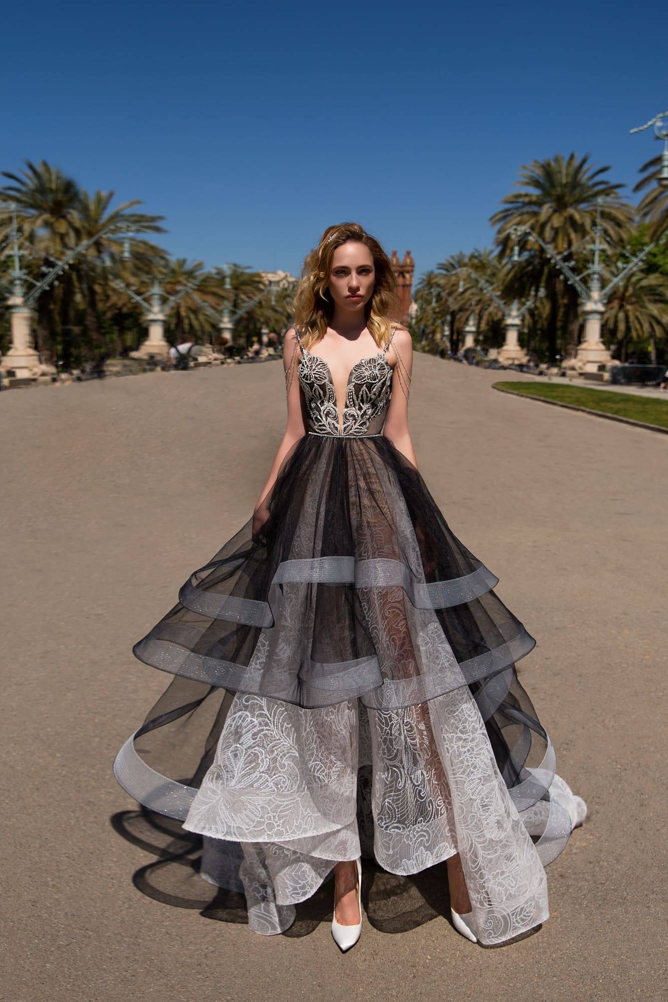 Оригинально и необычно выглядят короткие платья со шлейфом. Их стоит выбирать высоким женщинам модельной внешности
