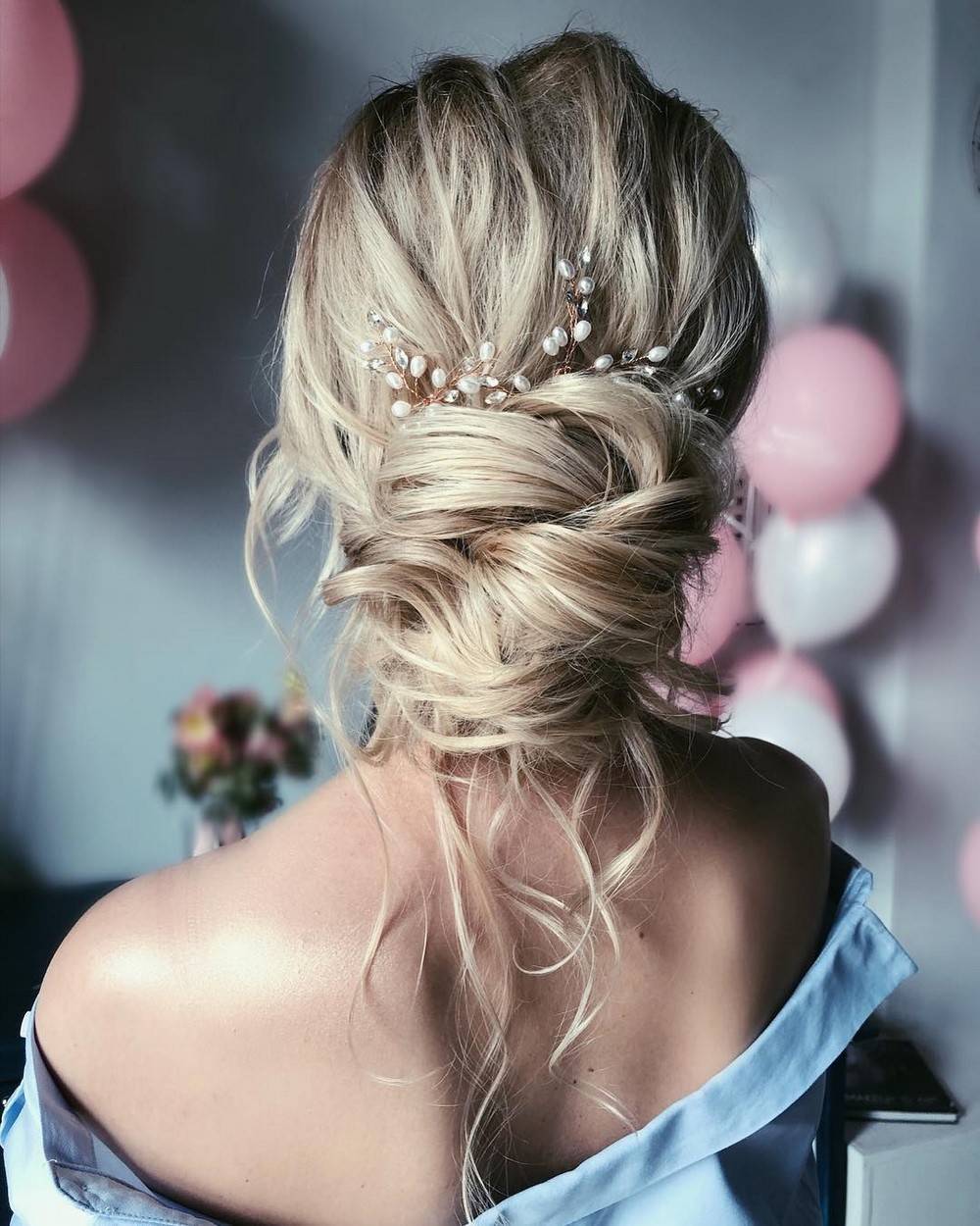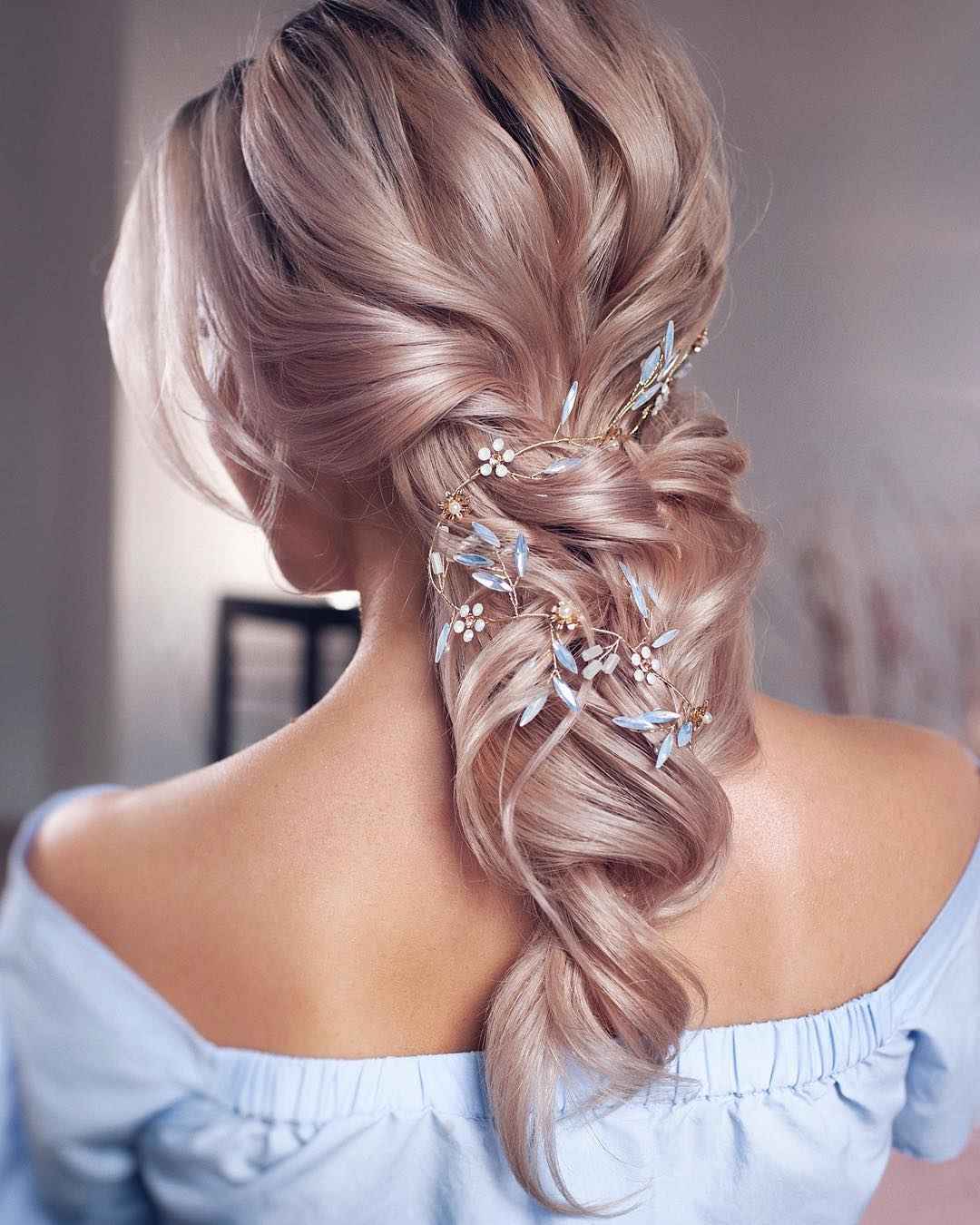 Данный вид свадебной укладки несомненно лидирует среди белокурых невест, ведь он выглядит не только нежно и подобающе свадебному мероприятию, но и эффектно, завораживающе. Волнистая текстура прически подчеркивает блондинистый цвет волос и оттеняет броские украшения, делая укладку магнитом, притягивающим восхищенные взгляды. При этом волосы остаются распущенными или собираются в хвост или косу со сложным плетением. Украсить такую укладку можно нитями с жемчугом (или подобной ему бижутерией), различными блестящими стразами, искусственными или живыми цветами.