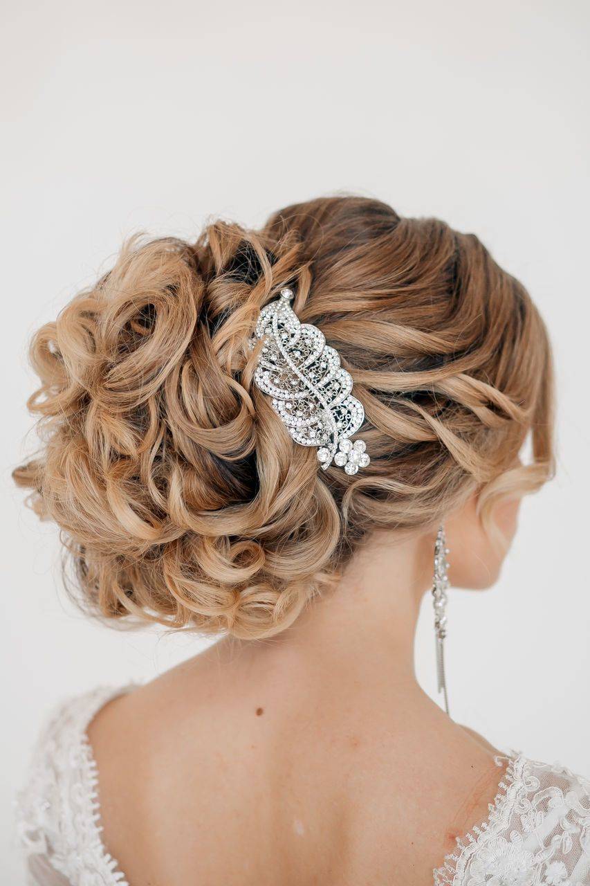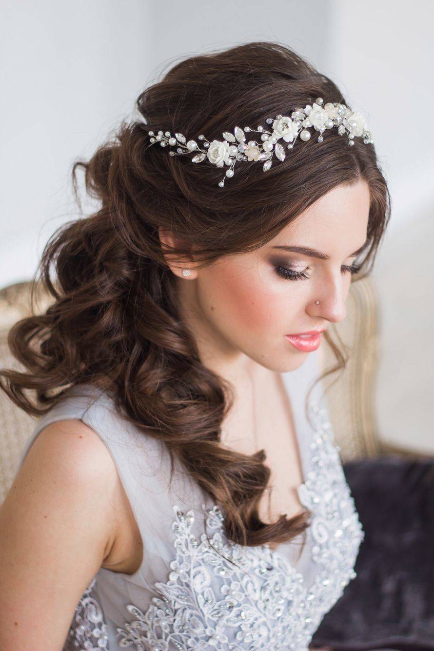 Свадебные прически с короной или диадемой тоже остаются на гребне волны. Такое решение приветствуется при создании образа в классическом стиле. В волосы можно вставлять разнообразные заколки, использовать драгоценные камни или их имитацию — все это играет на руку невесте, притягивая взгляды к ее локонам.