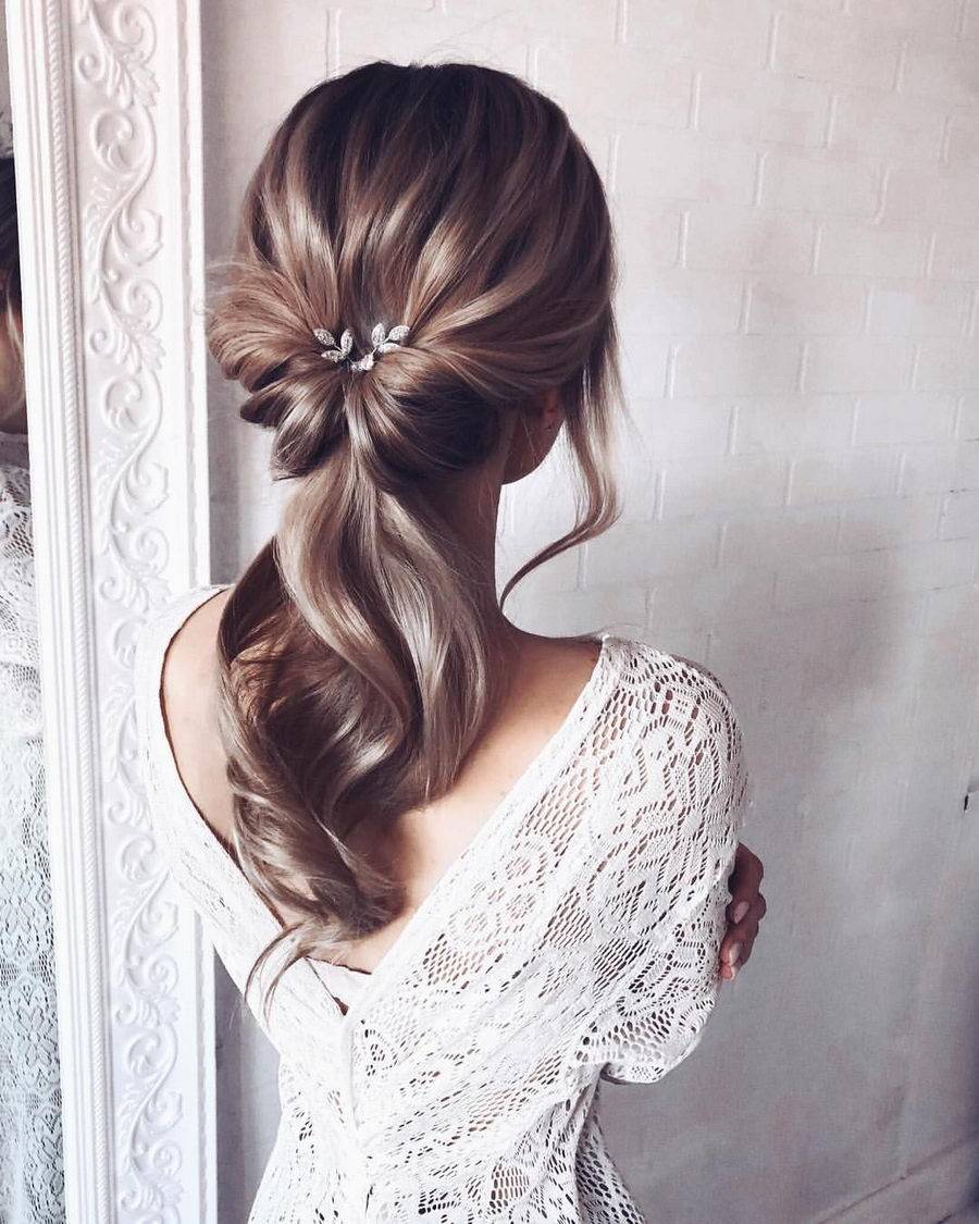 Если необходимо выбрать прическу на свадьбу для невесты под кружевное платье с открытой спиной, то можно спустить локоны или их часть на спину так, чтобы они немного прикрывали оголенную кожу. Благодаря этому образ станет игривым и дополненным.