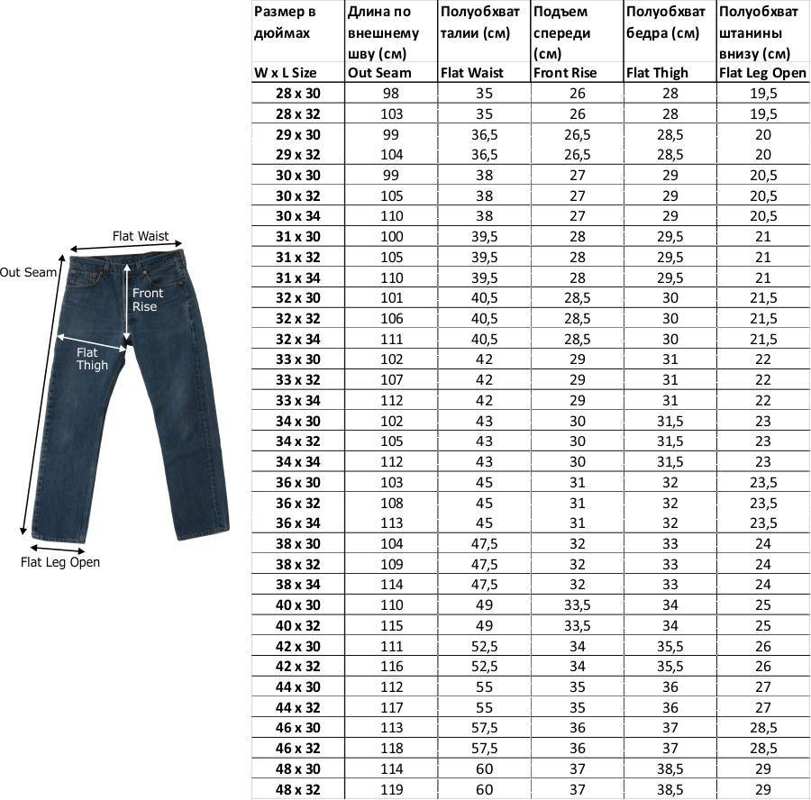 Размерная сетка Levis маркируется в дюймах. Чтобы перевести дюймы в сантиметры, нужно это значение умножить на 2,54.