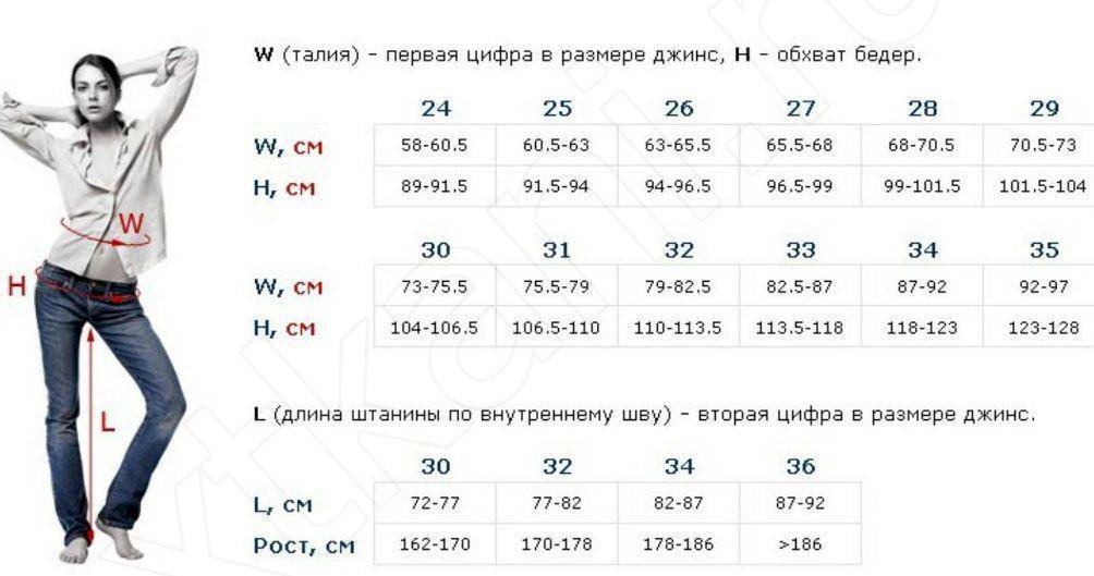 Чтобы определить размер джинсов для женщин, производители ориентируются на обхват талии, обозначая его W. Длина изделия L бывает трех размеров: L30 для девушек ростом от 160 до 170 см, L32 – от 170 до 180 см, L34 – от 180 до 190 см. Так, джинсы W30L32 подойдут девушке с 46 размером тела и ростом до 180 см. Подробнее о размерах джинсов и любых других женских брюк рассказано здесь.