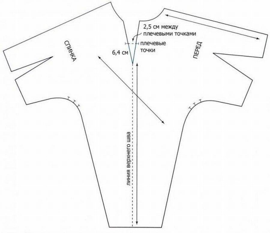 - Провести биссектрису из угла проймы на 5-7 сантиметров и плавно вывести низ рукавов и боковой шов;