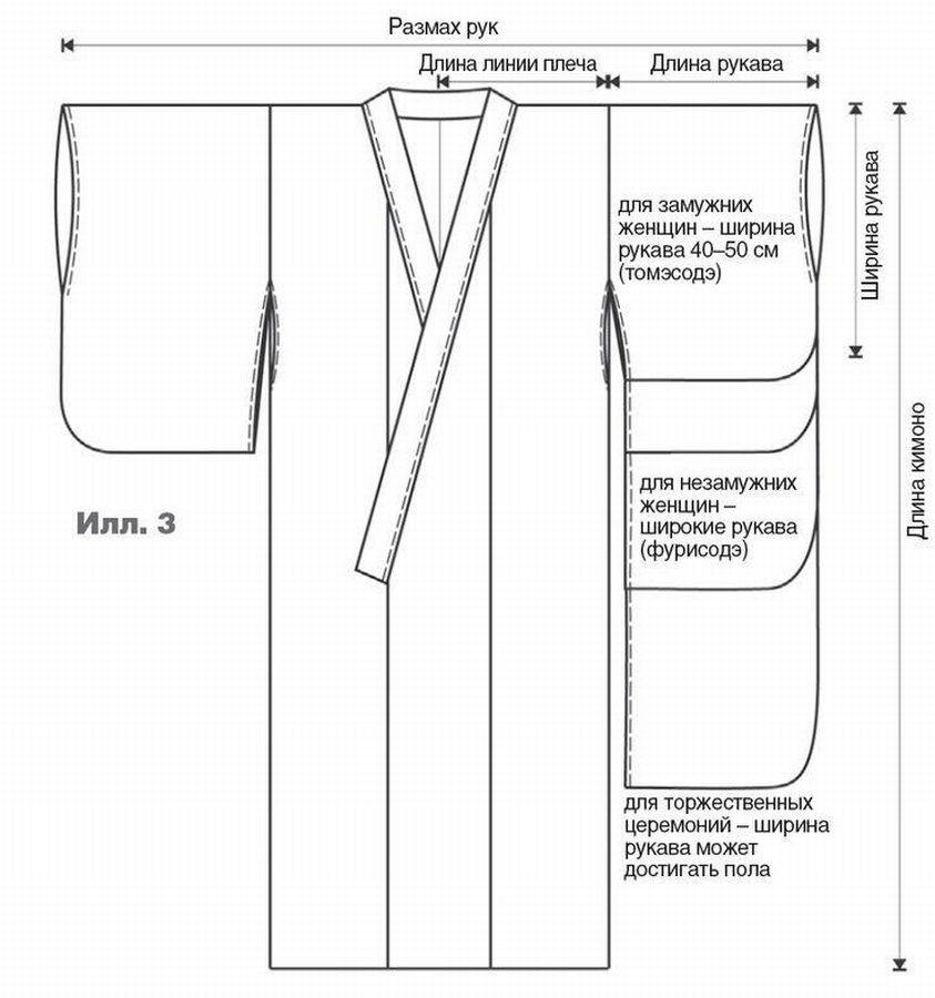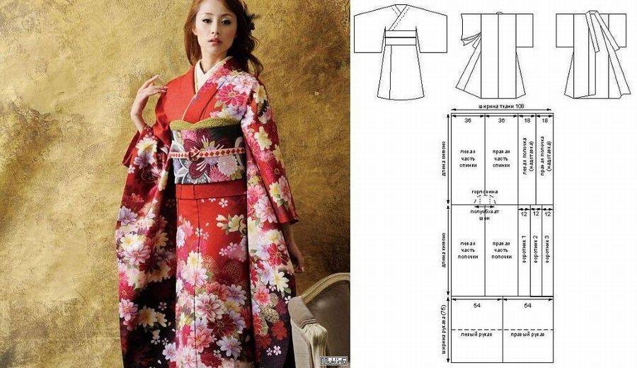 Кимоно — безразмерный халат, который подойдет на любую фигуру. Стандарт ширины спинки кимоно — 60 см. Она при помощи пояса драпируется на фигуре и изделие не кажется слишком большим. Если требуется больший объем, к основе добавляются клинья.