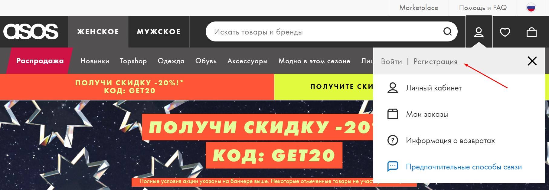 Самый начальный этап знакомства с магазином — это регистрация. На сайте asos.com она стандартная. Это значит, что вам нужно нажать на кнопку с «человечком», выбрать опцию «Регистрация».