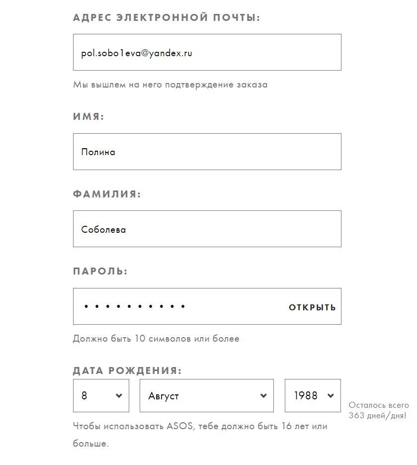 Далее, необходимо заполнить свои данные латиницей, желательно так, как они указаны в загранпаспорте (если таковой имеется). Также будут предложены варианты новостной рассылки — при желании их можно игнорировать или указать галочками, какие из них интересны. Жмем на «Зарегистрироваться на Asos»