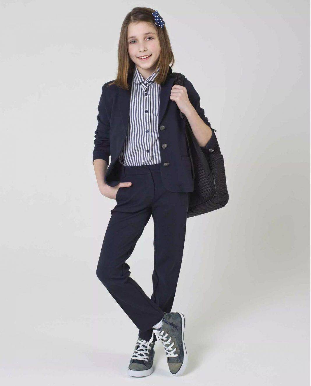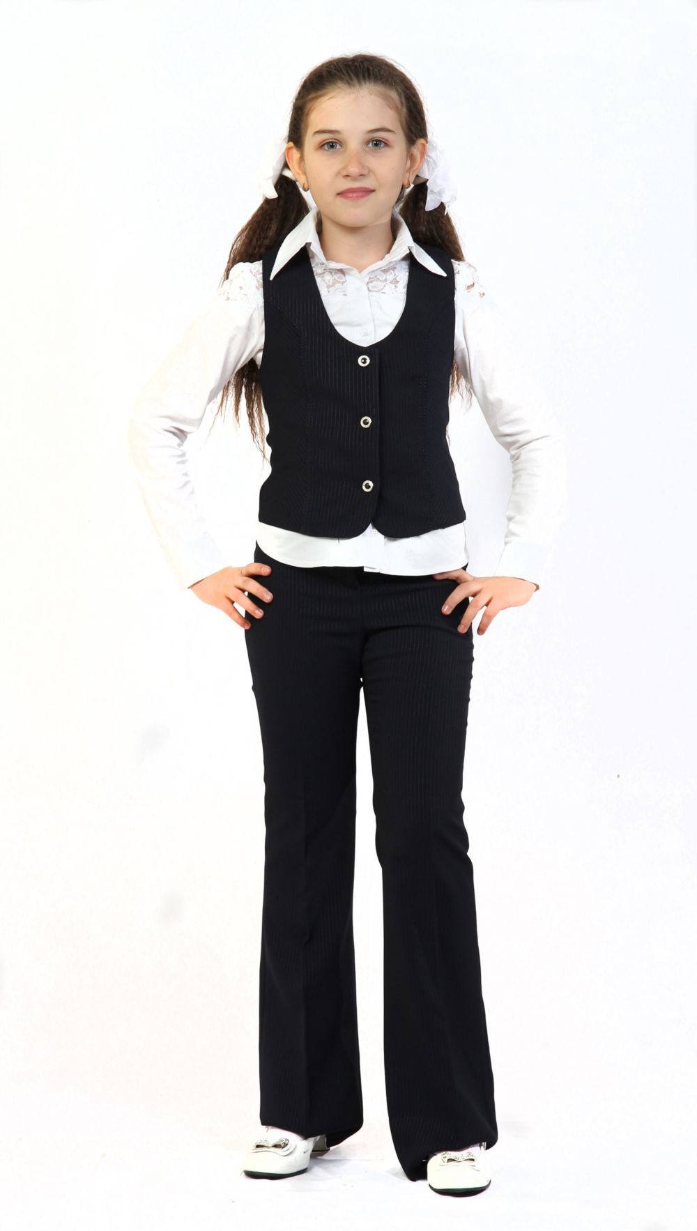 С подросткового возраста девочки начинают интересоваться всеми тонкостями моды. Именно с этим и связана резкая смена стиля девочки. Самой модной новинкой для девочек данного возраста являются невероятно стильные и популярные брюки маст-хев. Но это еще не все, поскольку стилисты создали невероятное количество разнообразных фасонов, которые выглядят непревзойденно, при этом они не выходят за рамки школьной формы. Невероятной популярностью для девочек подросткового возраста пользуются брюки с завышенной талией. Они могут быть выполнены с зауженным низом или стандартным прямым кроем. Выбирать необходимо тот фасон, который смотрится на девочке утонченно и гармонично. Независимо от выбранных брюк, лучше всего сочетать их с блузкой нейтрального оттенка или в цветовой гамме пастельного тона. Дополнить наряд можно подходящим по стилю жакетом. Он не должен быть излишне укороченным или длинным. Самый подходящий и оптимальный вариант — это жакет классического кроя, соответствующий тону школьных брюк.