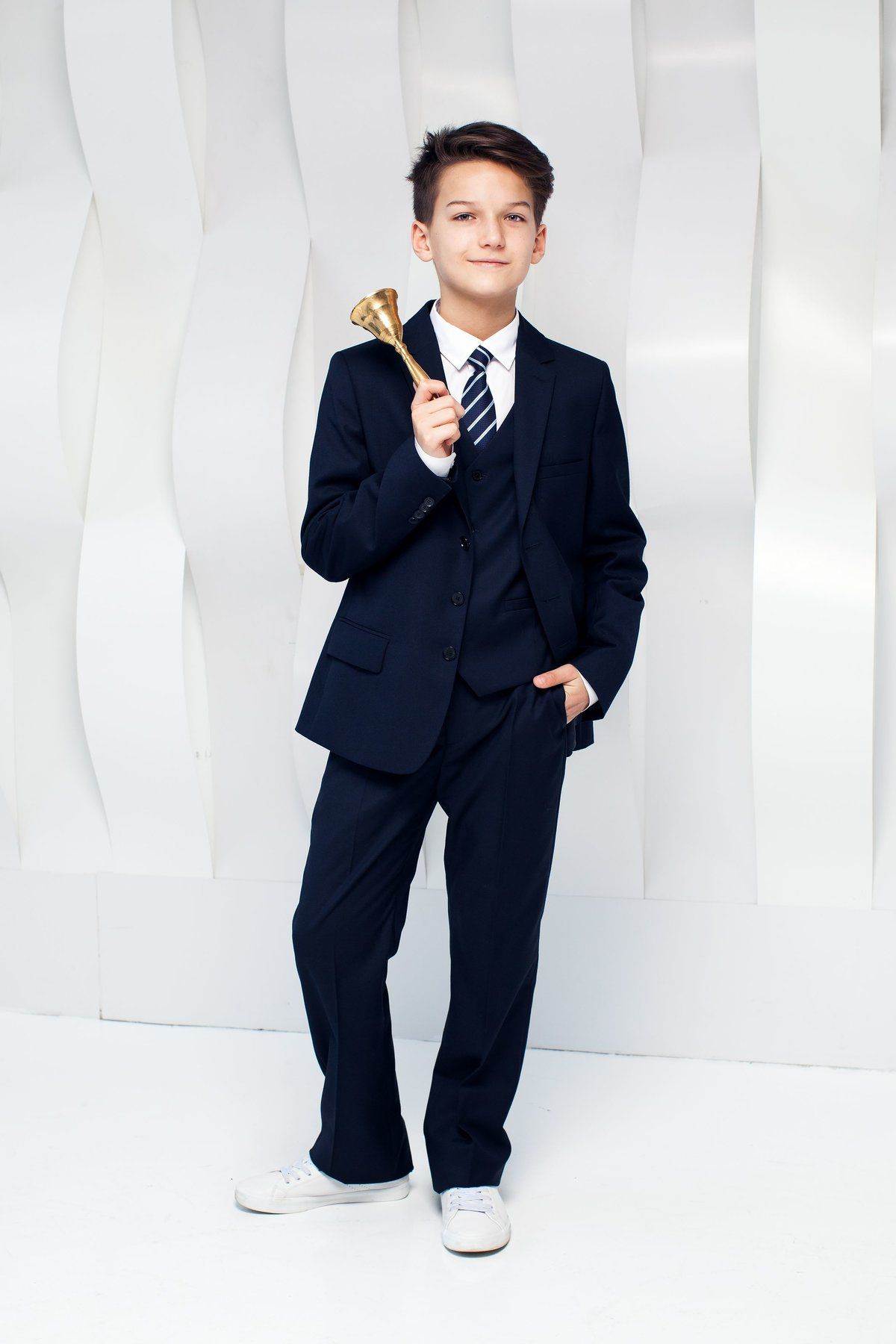 В старших классах мальчики уже начинают экспериментировать с образами. Среди учеников средних и старших классов в тренде зауженные модели в черном и синем цвете. Они отлично смотрятся с белыми рубашками, кардиганами, жилетками и пиджаками.