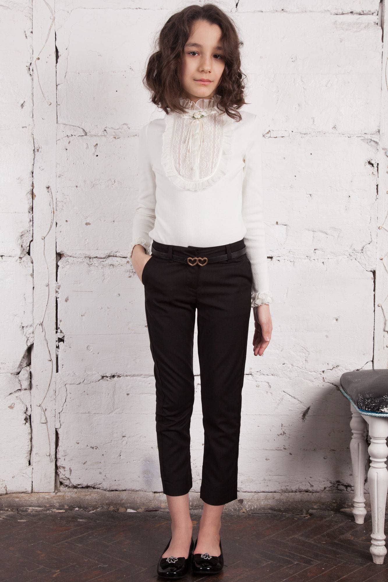 Для стильного и привлекательного образа нужно научиться гармонировать школьные брюки с другими элементами девичьего гардероба. Под прямые брюки, кюлоты, капри, зауженные модели прекрасно подходят белые, светло-серые, голубые, бежевые, песочные, нежно-розовые блузы и водолазки. Поверх них надевается жакет, жилетка, пиджак или болеро в темных тонах.