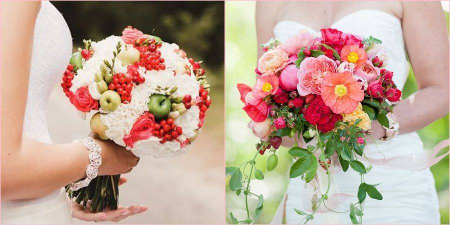 Если хотите композицию более интересную, то Вам в помощь маки и подсолнухи. Необычной идеей в последние годы стало сочетать цветы с ягодами, фруктами и овощами. Ведь летом природа нам дарит много разнообразных плодов, которыми можно воспользоваться при составлении свадебной композиции.