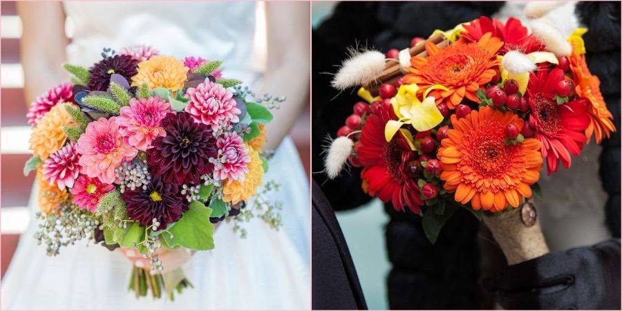 - Пора года. Зимой отличным выбором станет белый и синий букет, весной – пастельный, летом – персиковый, ярко-розовый и желтый с зелеными нотками, а осенью – желтый, бордовый и оранжевый.