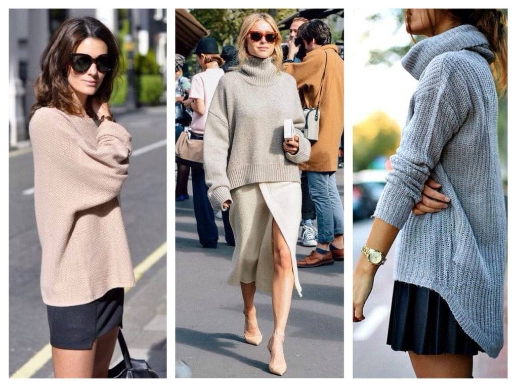 Свитера оверсайз — еще один актуальный тренд холодного сезона 2019-2020. Напомним, что чтобы не выглядеть неряшливо, такой свитер лучше сочетать с узкими или прямыми брюками, или облегающей юбкой. Свитер оверсайз — модно и тепло