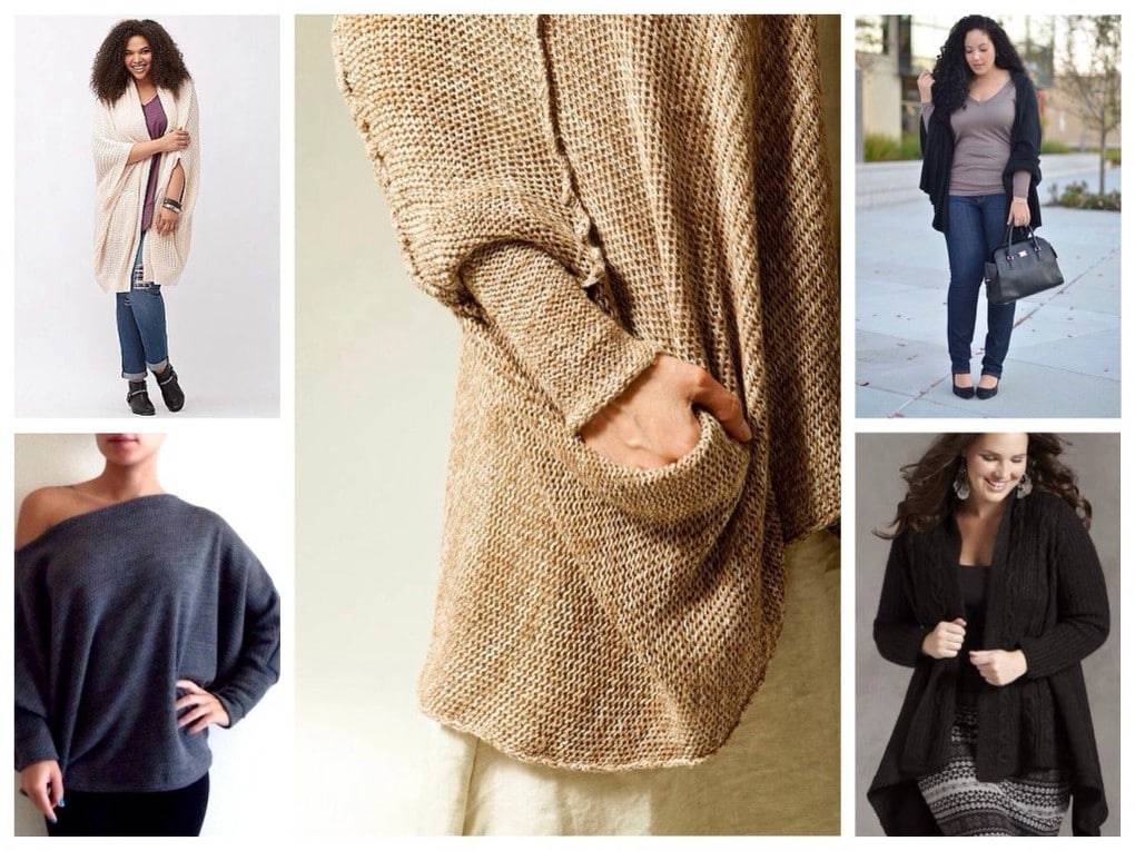 - Кофты для полных женщин с объемными воротниками помогут скрыть полную шею, но они подходят только дамам с длинной шеей. Чтобы подчеркнуть красоту большой груди , пышечкам рекомендуются кофты с V-образным вырезом.