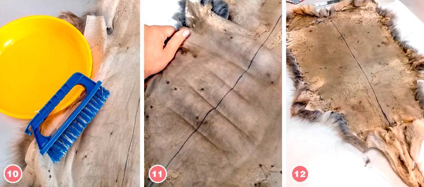 4. После пролежки несильно растянуть шкурку от середины в разные стороны, сначала вдоль хребтовой линии, потом – поперек, расправляя неровности и заломы на кожевой ткани (11).