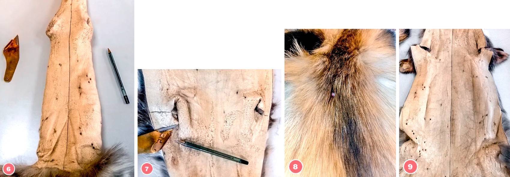 2. Перевести на кожевую сторону шкурки линию хребта при помощи булавок (8, 9).