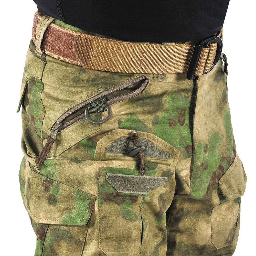 При пошиве тактических брюк особое место занимает покрой. У самых лучших и удобных моделей тройные швы. В настоящее время даже российские производители стали шить по этому принципу. Пояс снабжён специальной утягивающей резинкой. Концы штанин имеют завязки или липучки для удобной фиксации, но это не обязательно. На поясе тактических брюк расположены широкие шлицы для ремня-портупеи. Они делаются из многослойной ткани и крепко пришиваются, так как на ремне часто располагается много тяжёлых аксессуаров.