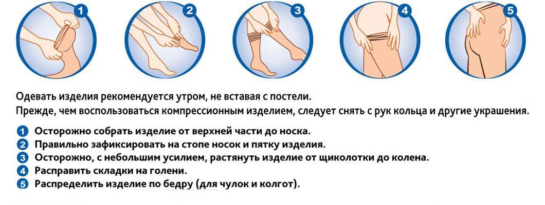 Родовые чулки обладают плотной структурой, они тугие и плохо тянутся. Перед надеванием изучают инструкцию по применению чулок. Чтобы избежать порчи компрессионного изделия, ногти подстригают, украшения снимают. Сохранить маникюр помогут резиновые перчатки. Не допускается натягивание белья от варикоза на мокрое тело. Надевать чулки нужно утром, перед этим ноги на несколько минут приподнимают наверх.