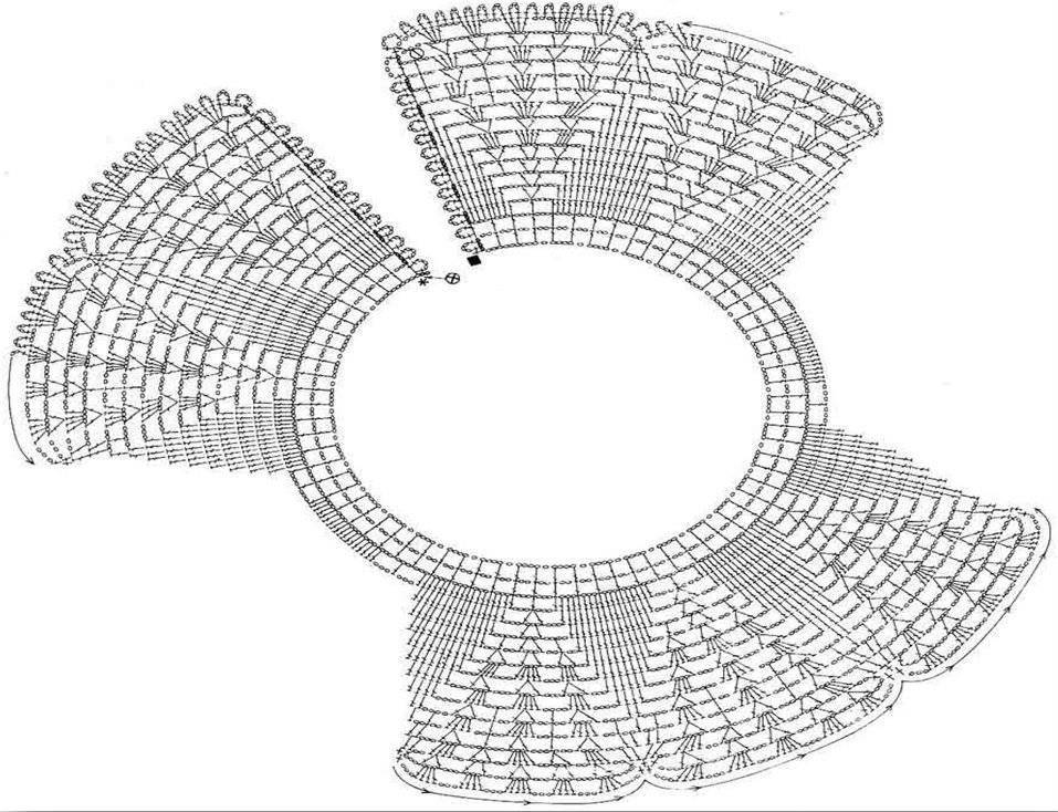 Если вязаные воротнички крючком на схемах рисуют так, как приведено ниже, это не значит, что изделие не должно быть круглым. Просто одинаковые паттерны рисунка опускают, давая для подробного разбора центральную часть и оба края, так как на них рисунок обычно отличается от остальных раппортов. Иногда это делается из экономии места на листе, чтобы было где разместить информацию об условных обозначениях, выборе ниток и т. д. Часто на рисунках бывает указано направление вязания. Например, в этой работе показано, как отделывать наружный край ажурного воротничка крючком, вывязывая простой вариант «брюггской тесьмы».