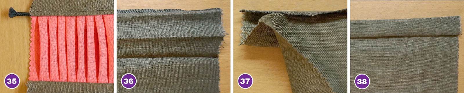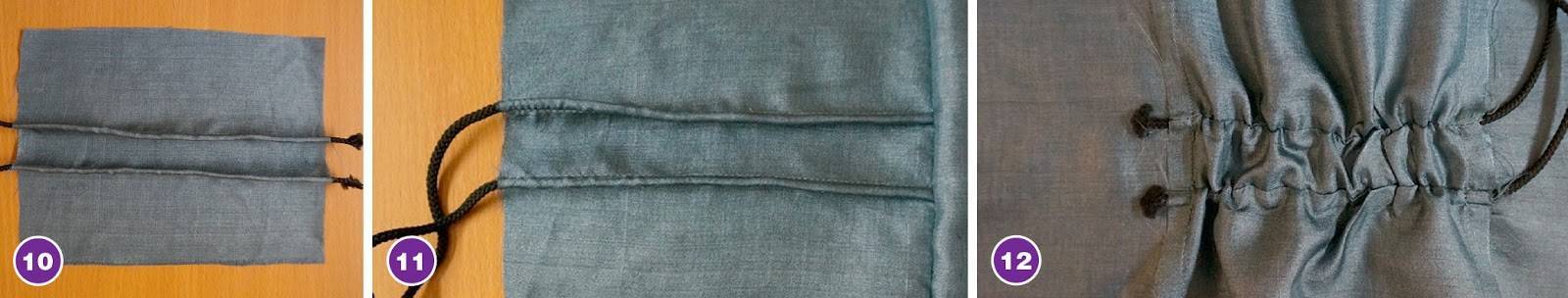 По всей длине ленты, в зависимости от толщины могут проходить от 1 до 4 рядов с продетым шнуром. Длина стежков может быть одинаковой или чередоваться в разной последовательности: длинные и короткие стежки. Количество рядов со шнуром и варианты чередования стежков влияют на то, какими будут сформированы складки при стягивании шнура.