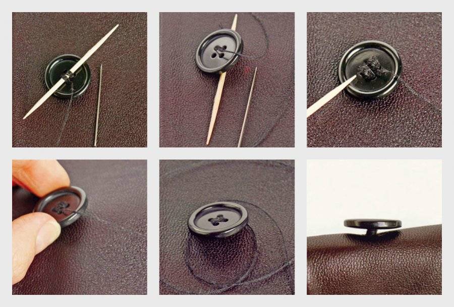 Пуговицы на одежду из кожи пришивают особым образом — с дублирующей пуговицей с изнаночной стороны.