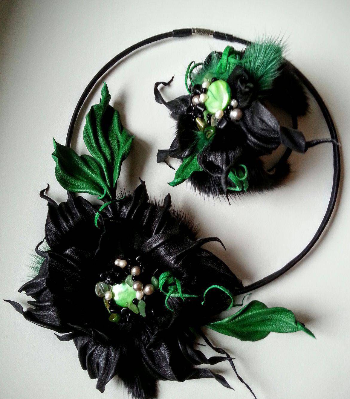 Вырезают несколько ярусов лепестков для цветов. Проволочка обтягивается кожаным материалом. Затем нужно собрать цветок, начиная с нижнего яруса. При этом нижние лепестки сразу клеятся к проволоке, а на них прикрепляются все остальные. Серединка цветка украшается блестящим камнем или бусиной. Подобным образом нужно наклеить все цветы. Оставшиеся кончики проволоки скрыть под нанизанными на них бусинками. После закрепления застёжки колье будет готово.