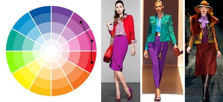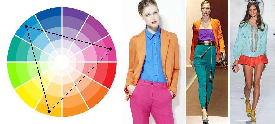 Триада — схема строится на сочетании 3 цветов, находящихся на равном промежутке друг от друга. Соединение их на схеме создаёт равносторонний треугольник, вершинами которого и являются выбранные цвета. Все 3 могут находиться на равенстве, включённые в один образ либо 1 является доминирующим, а 2 других его дополняют.