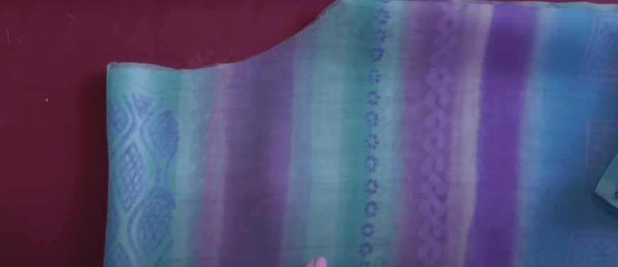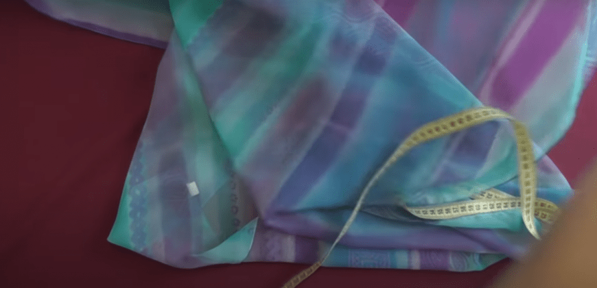 - Отрезанной кусок ткани кладут на плечи, краями вперед как-будто шарф и тщательно расправляют по телу будущего обладателя туники;