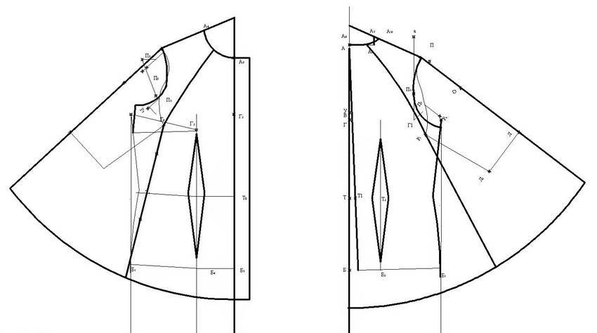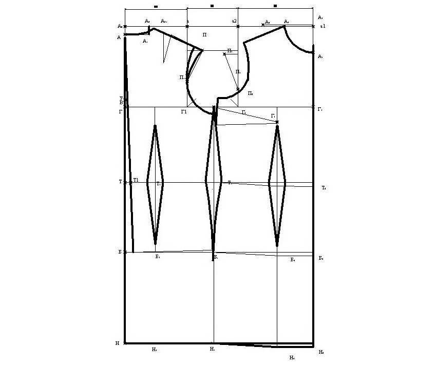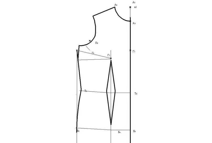 - От Г отмерить расстояние, равное половине от обхвата груди, поставить отметку Г1. Через нее провести вертикаль вниз до получения пересечений с линиями – точек Т1, Н1, Б1.