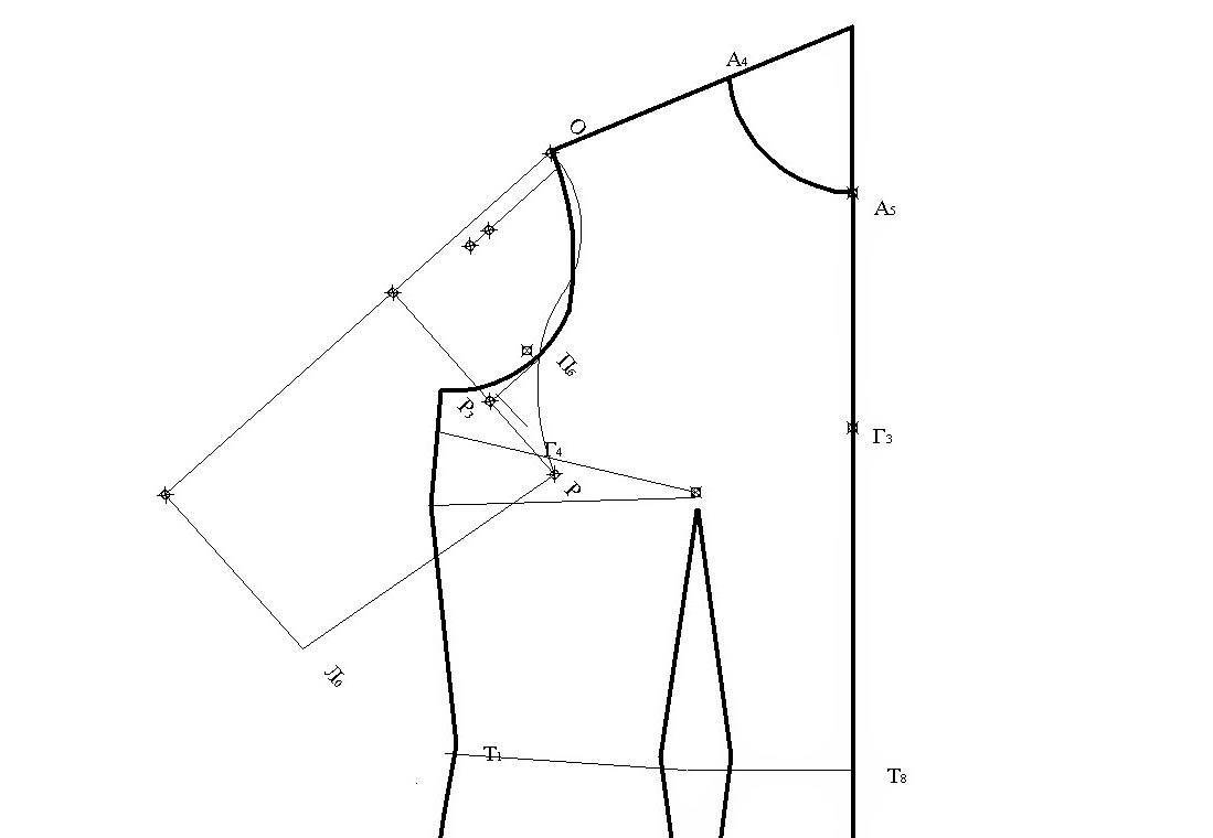 - Линии плеч по спинке и переду строятся откладыванием от точек Т и Т1 дуговых линий радиусом, равным высоте плеч спинки и переда минус 1 см.