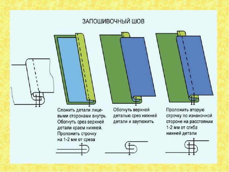 Подгибка ткани применяется по краям. На изнаночную сторону загибается припуск и приутюживается. После припуск прошивается прямой строчкой. Край припуска обрезается.