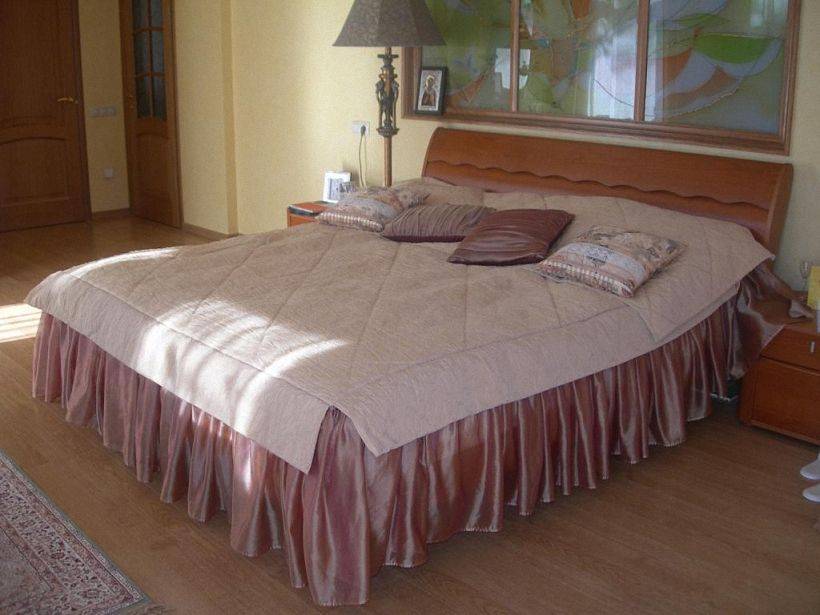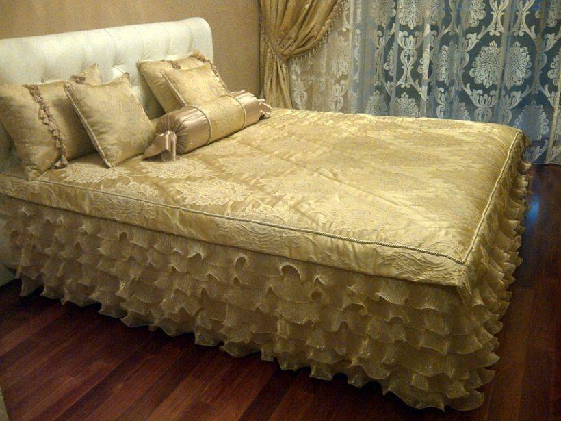 Для покрывала с оборками основную часть можно сделать стеганной самостоятельно или приобрести уже готовую. Для этого хорошо подойдет атласная однотонная ткань. Чтоб определить необходимый расход материи, нужно полосу собрать в складки требуемой формы и глубины, пока длина полученной оборки не достигнет метра. Выровнять ткань и измерить длину, которая затрачивается на метр. Умножив длину периметра краев изделия, выбранных для украшения, на рассчитанный коэффициент получим требуемую длину материи. Для кровати со спинкой украшение пришивается только с трех боков.
