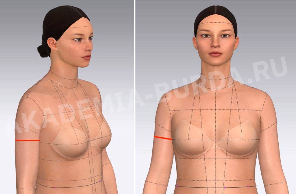 Цг (центр груди) — измеряется горизонтально между выступающими сосковыми точками. Величина делится пополам.